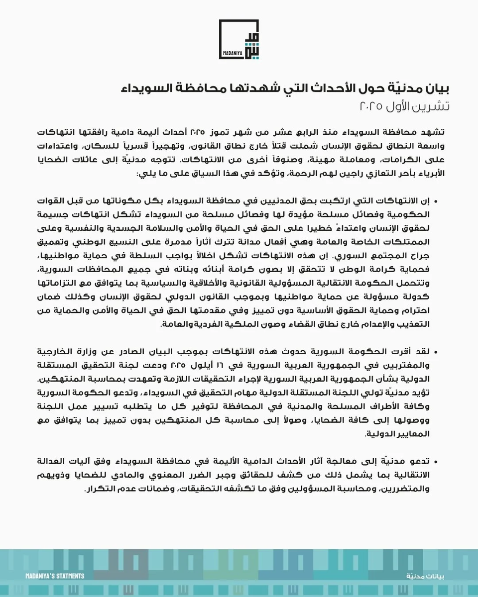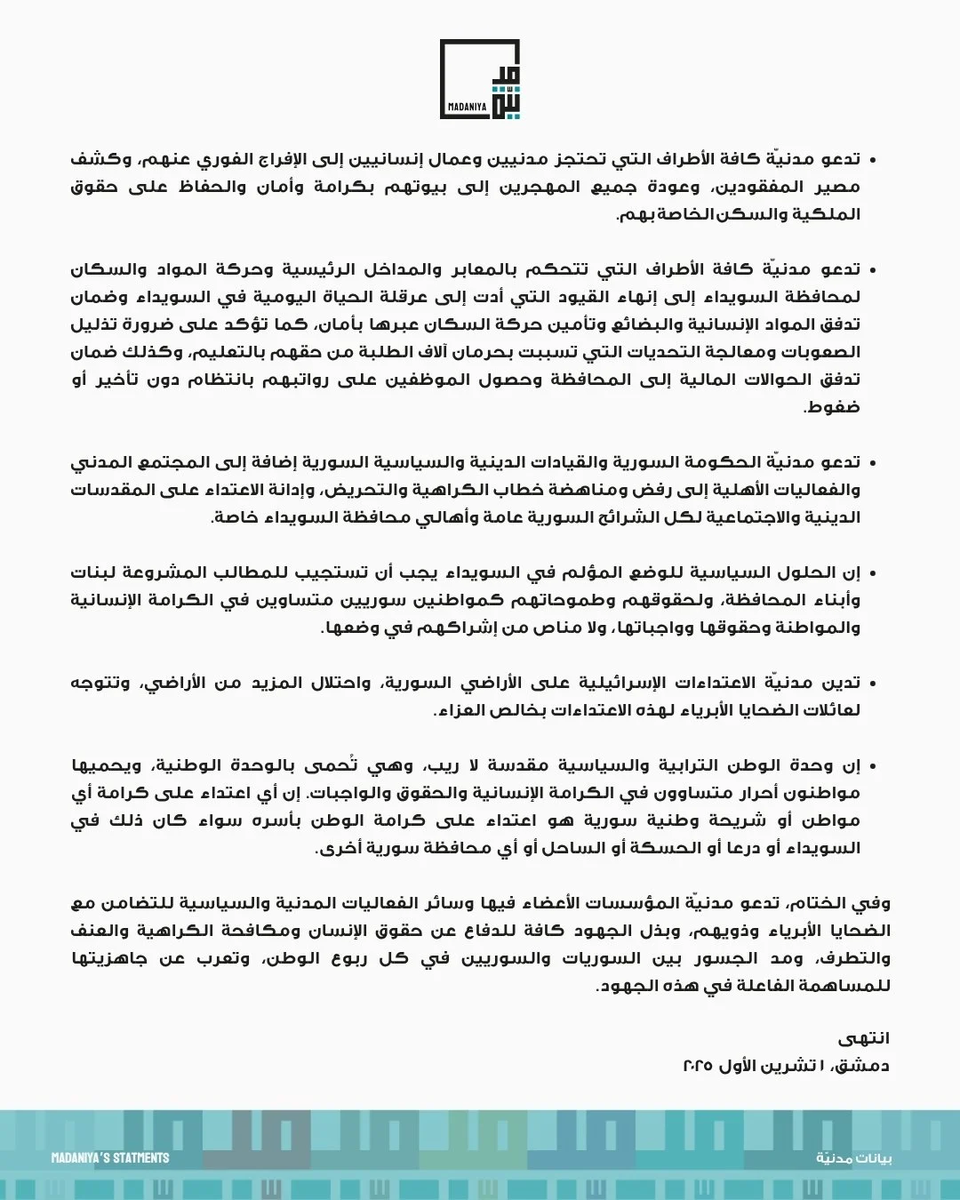 بيان مدنيّة حول الأحداث التي شهدتها محافظة السويداء